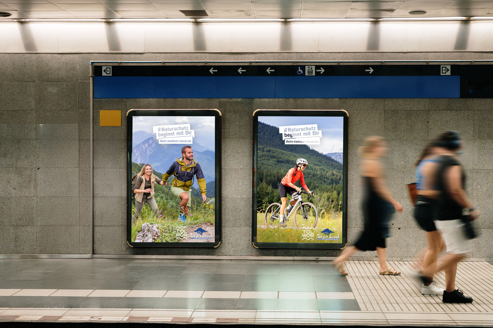 Mit der klaren Botschaft #Naturschutz beginnt mit Dir wird die Aufmerksamkeit der Passanten unmittelbar auf das Thema gelenkt und die Region Tölzer Land in der Großraummetropole München erlebbar gemacht.